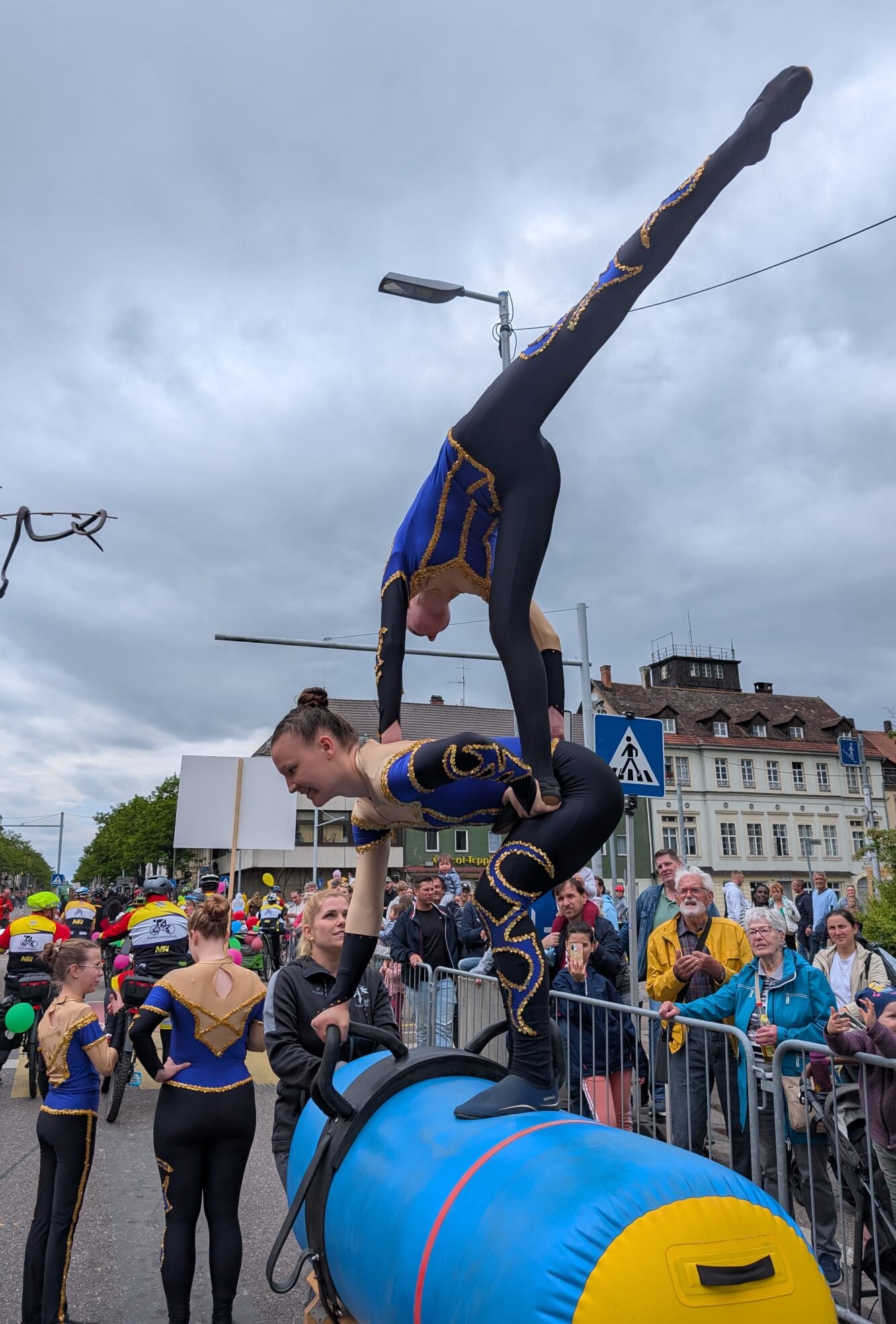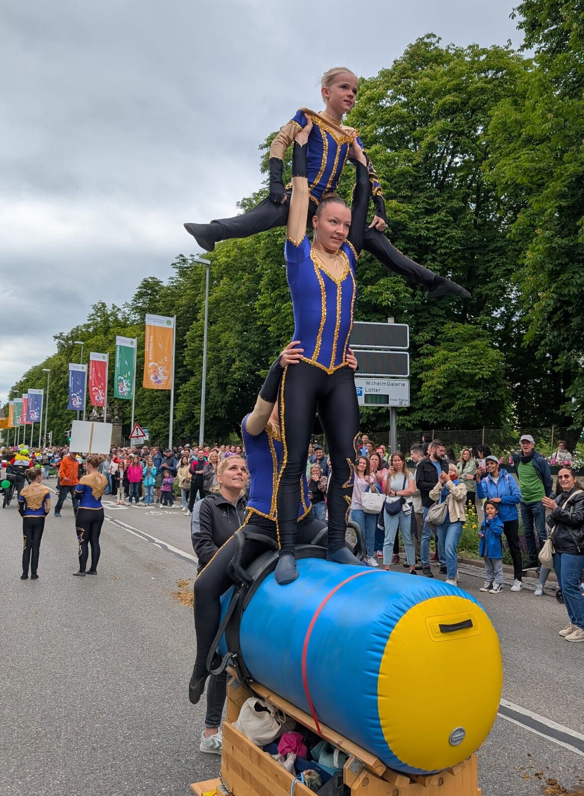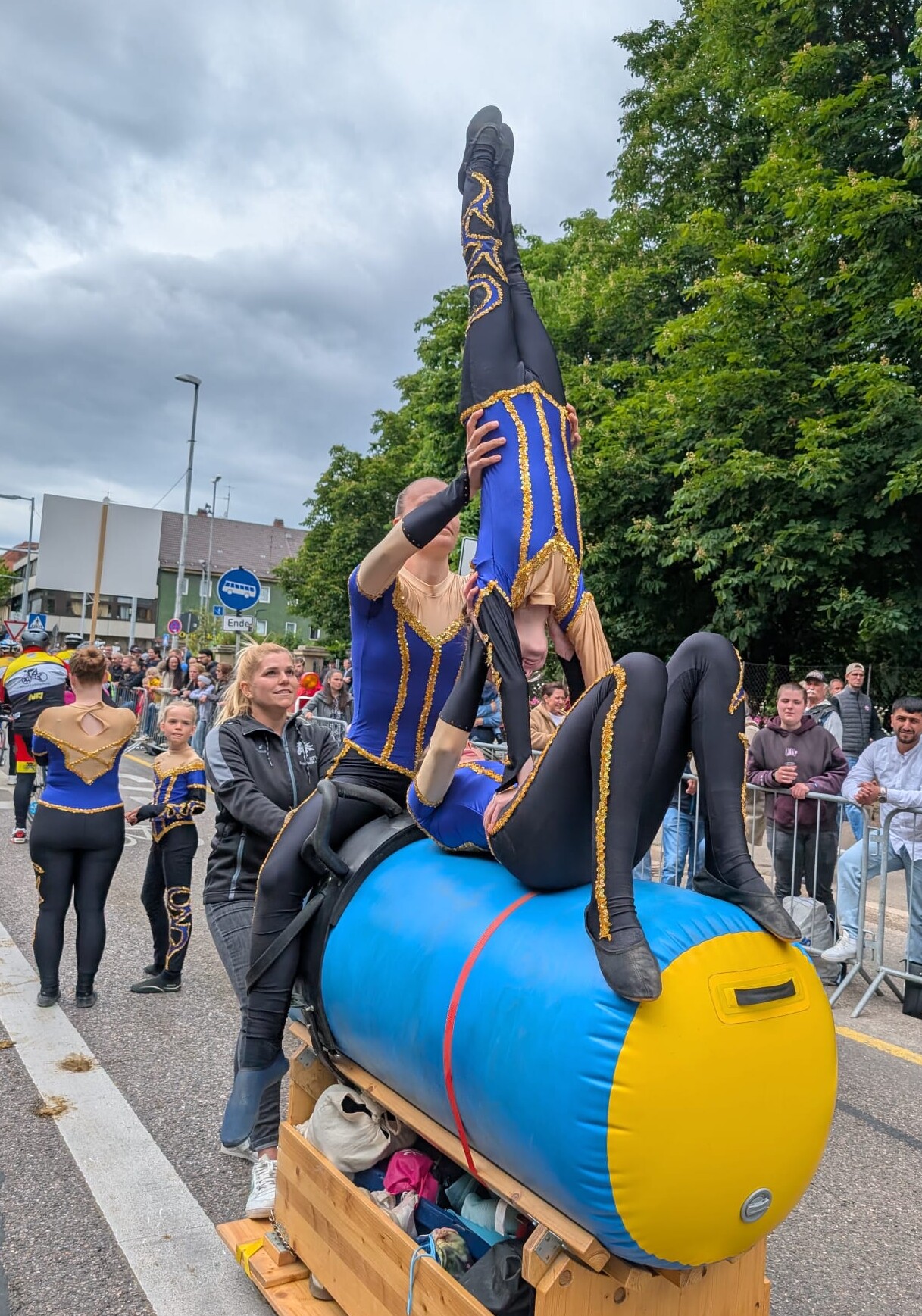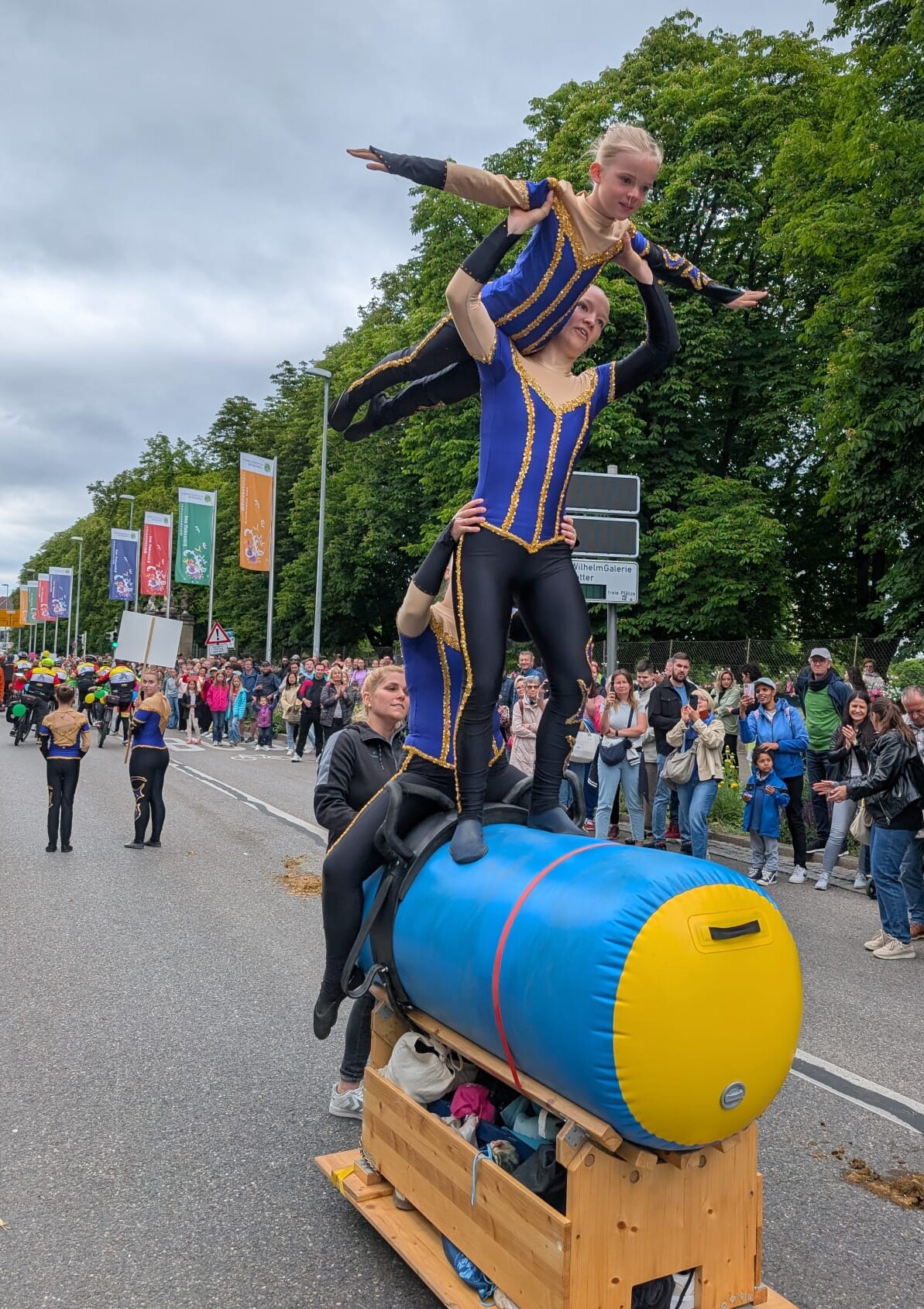 Unsere Voltigiermannschaft zeigte sich im Umzug voller Energie und Teamgeist in ihren Volti-Outfits. Auf „Rudi“, unserem Airhorse, führten sie tolle Übungen & Hebefiguren vor und begeisterten das Publikum entlang der Umzugsstrecke – der Applaus war ihnen sicher!